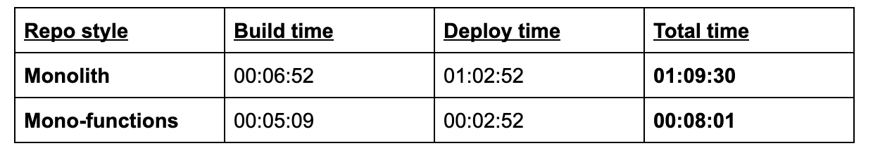 Whereas with the monolith we are forced to deploy every function every time, not only are deployments faster, but they are skipped entirely for those that haven’t changed.