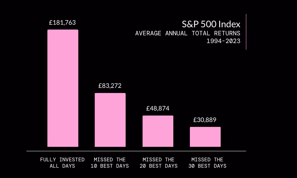 The chart above shows how a $10,000 investment in the S&P 500 between 1990 and 2023 would have grown. Missing just the 10 best days in the market would have drastically reduced your return compared to having been fully invested for the ups and downs alike. That’s because plenty of the greatest ‘recovery days’ came right after market drops.