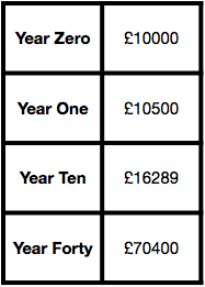 Table: Compound interest projection over 40 years with 5% annual return on a £10,000 initial investment.