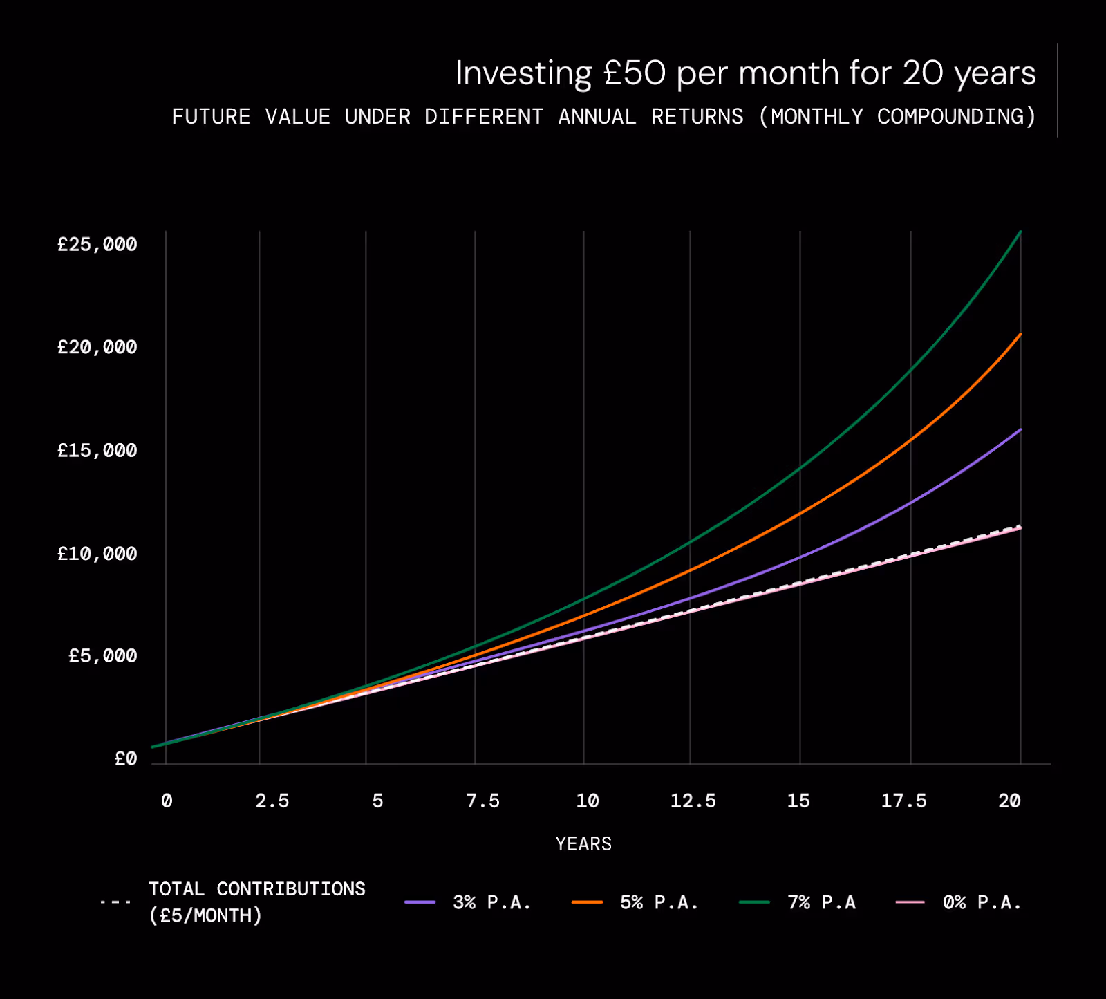 Even without any growth, you would have £12,000 set aside after two decades. Growth can lead to even stronger returns from your seemingly low levels of investing.