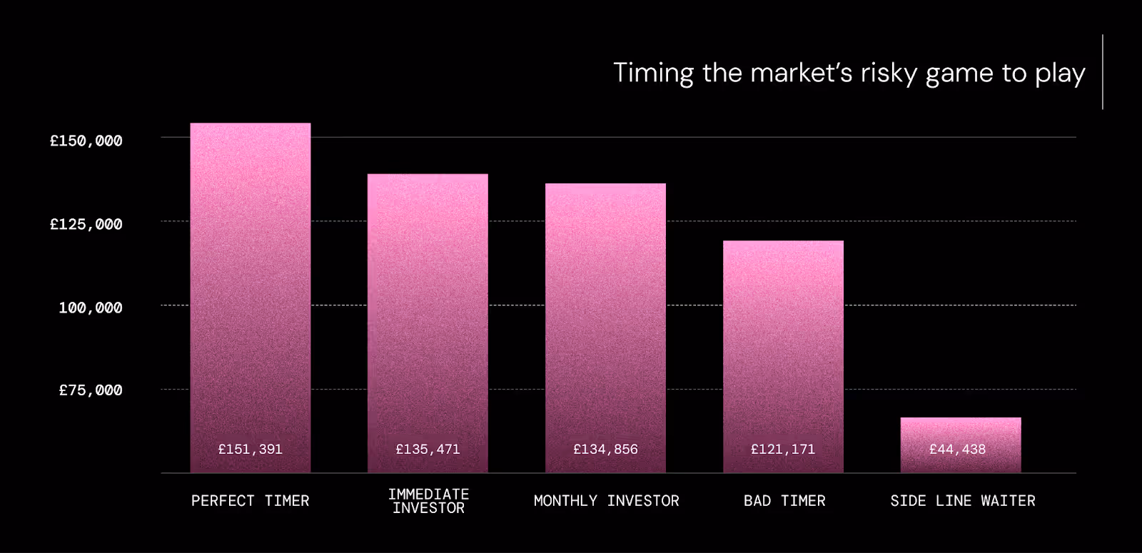 Perfect timing won, but expecting to pick the exact right moment to invest is, to put it mildly, a little unrealistic. A timing obsessive could just as easily have been the bad timer, or even the side line waiter.