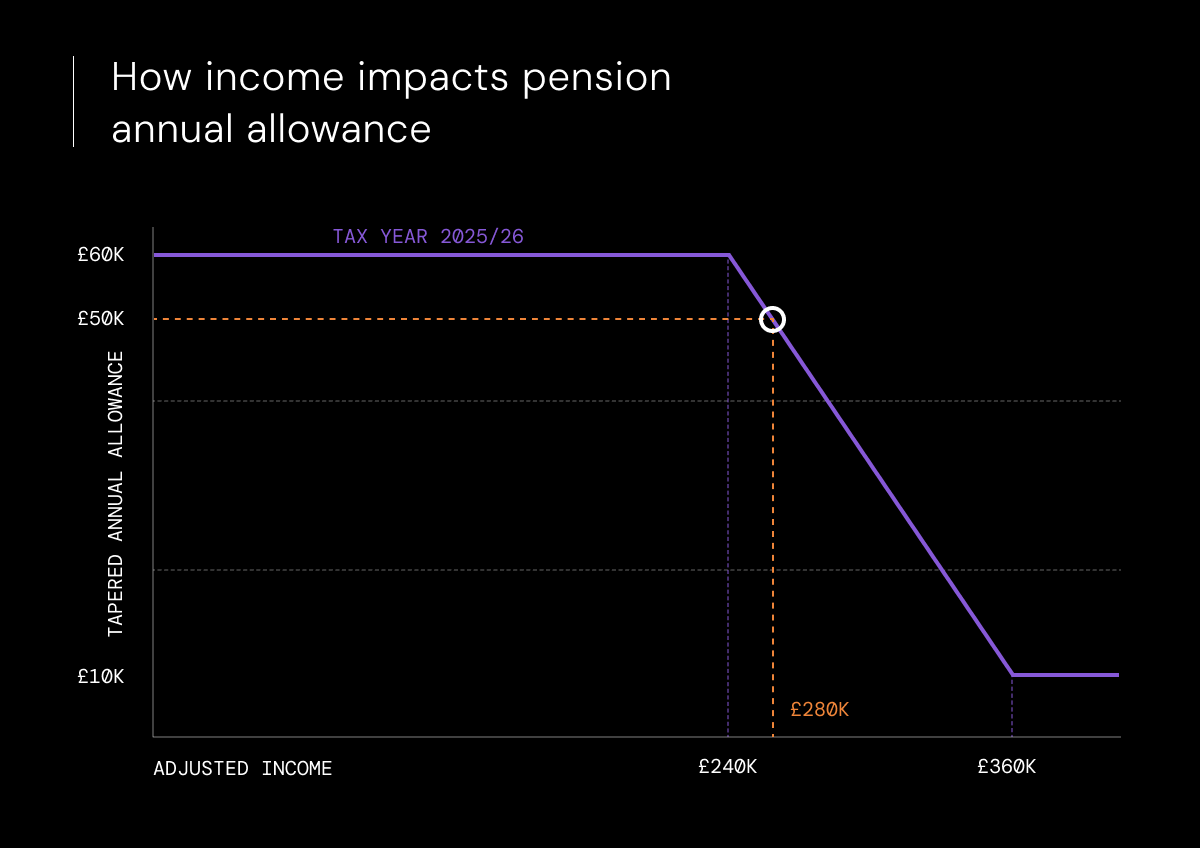 For example, if you have a threshold income above £200,000 and your adjusted annual income is £280,000, your annual allowance will be reduced by £10,000 to £50,000.