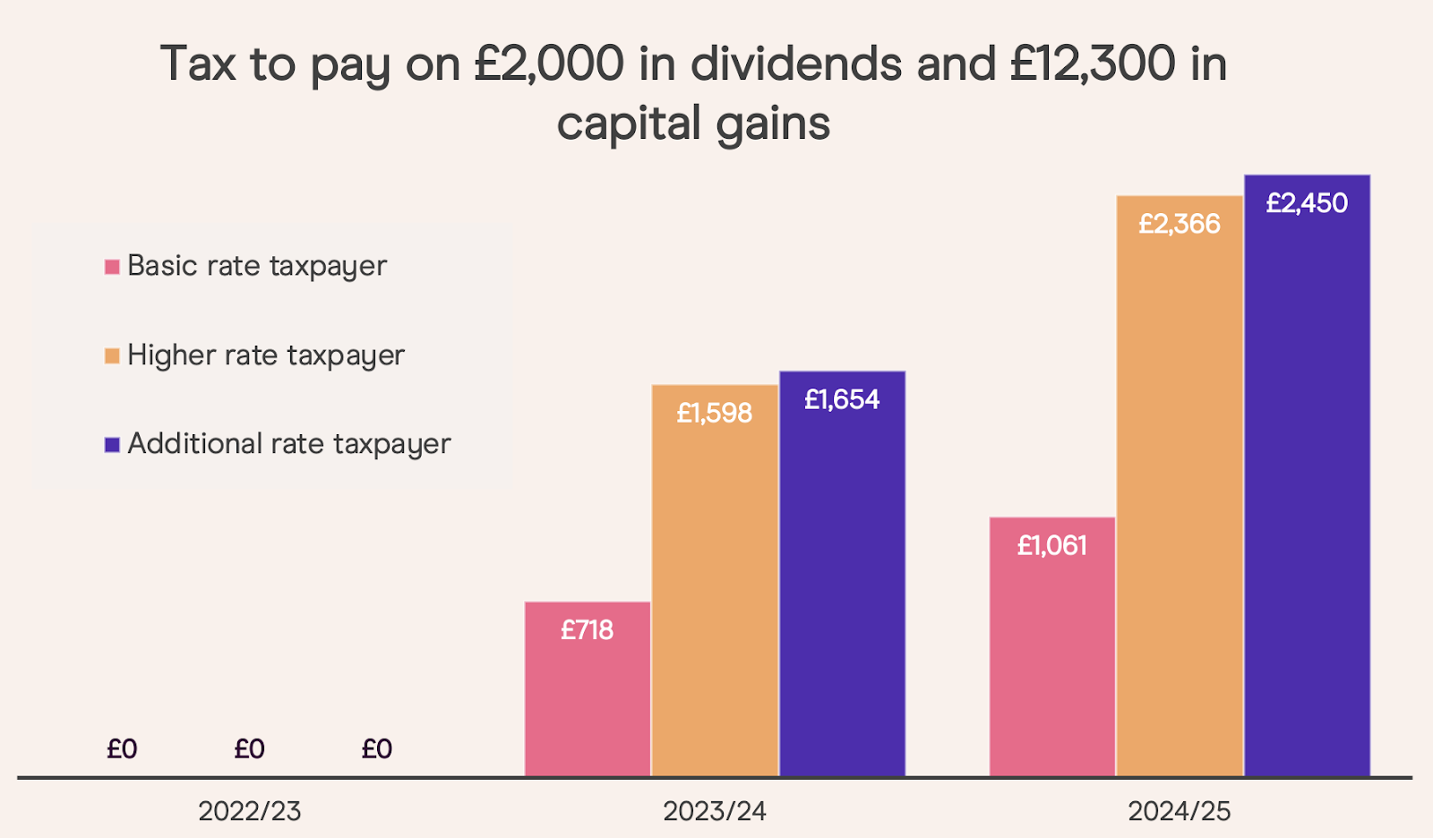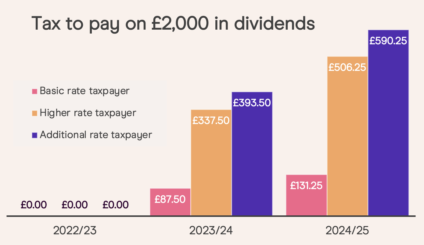 Putting the changes to the dividend allowance into perspective, a basic rate taxpayer earning £2,000 in dividends in the 2022/23 tax year, and earning the same dividend income for the next two years, would suddenly have to pay £87.50 in 2023/24, then £131.25 in 2024/2025.
