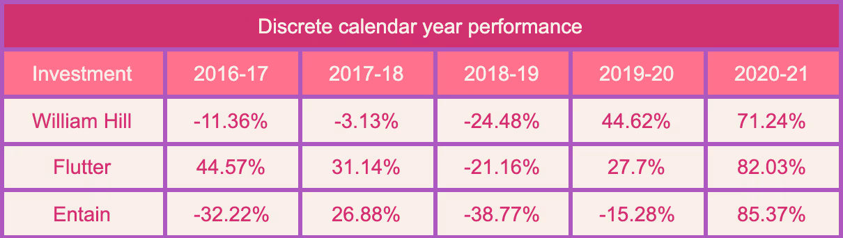 Shares in William Hill have almost doubled in price over the past year. For Flutter and Entain the figures are 71% and 50% respectively.