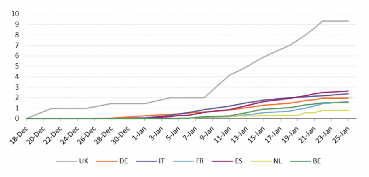 Around 11% of the UK population has received a vaccine by now but that figure drops to less than 2% in many eurozone countries.