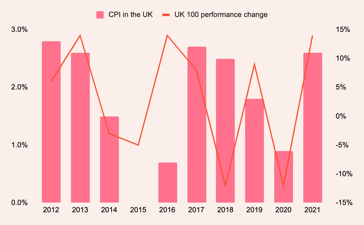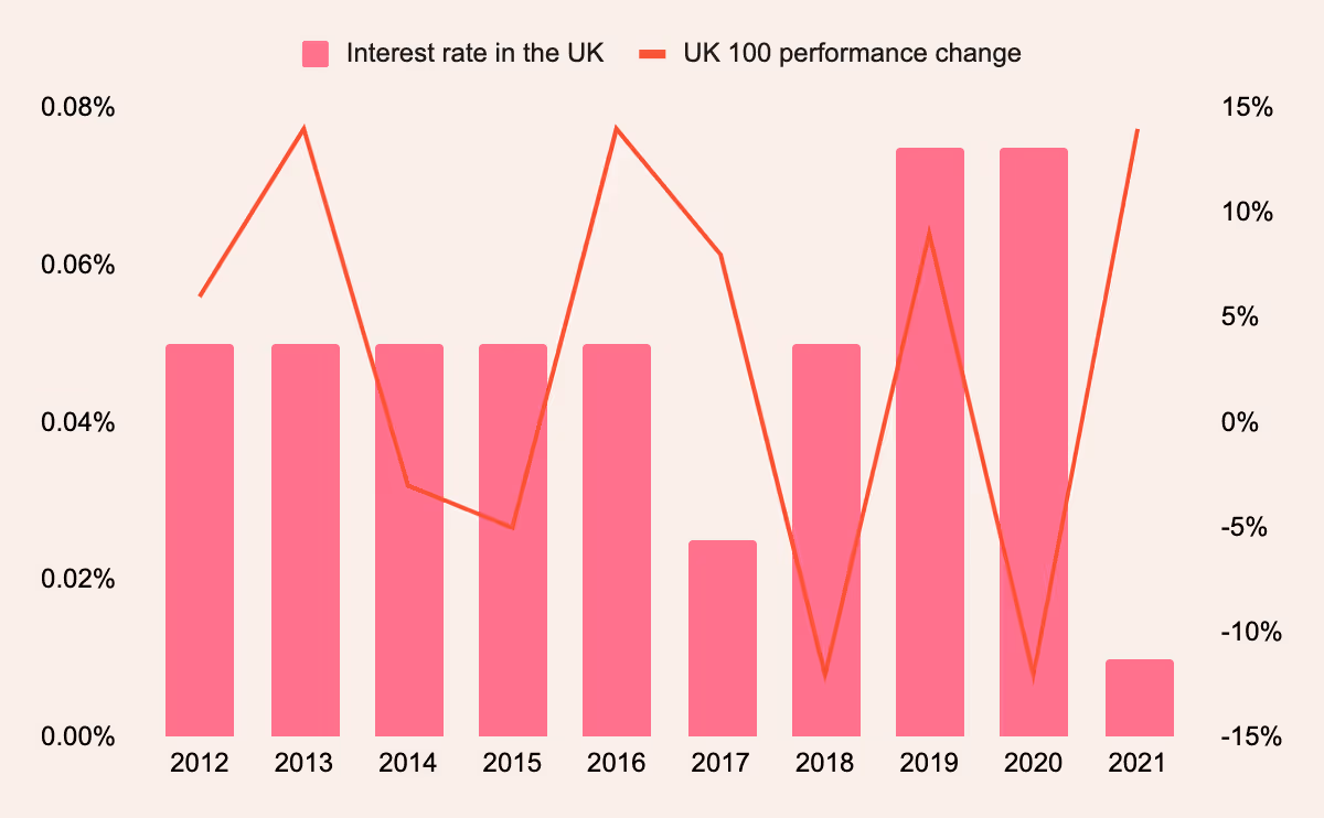 But history paints a fairly different picture. When rates went from 0.5% to 0.75% in 2019, the UK’s top 100 shares had an average return of around 9%. The following year, rates stayed the same, and those shares fell by 12%. Then rates tumbled to 0.1% in 2021, as the UK 100 shot up by 14%.