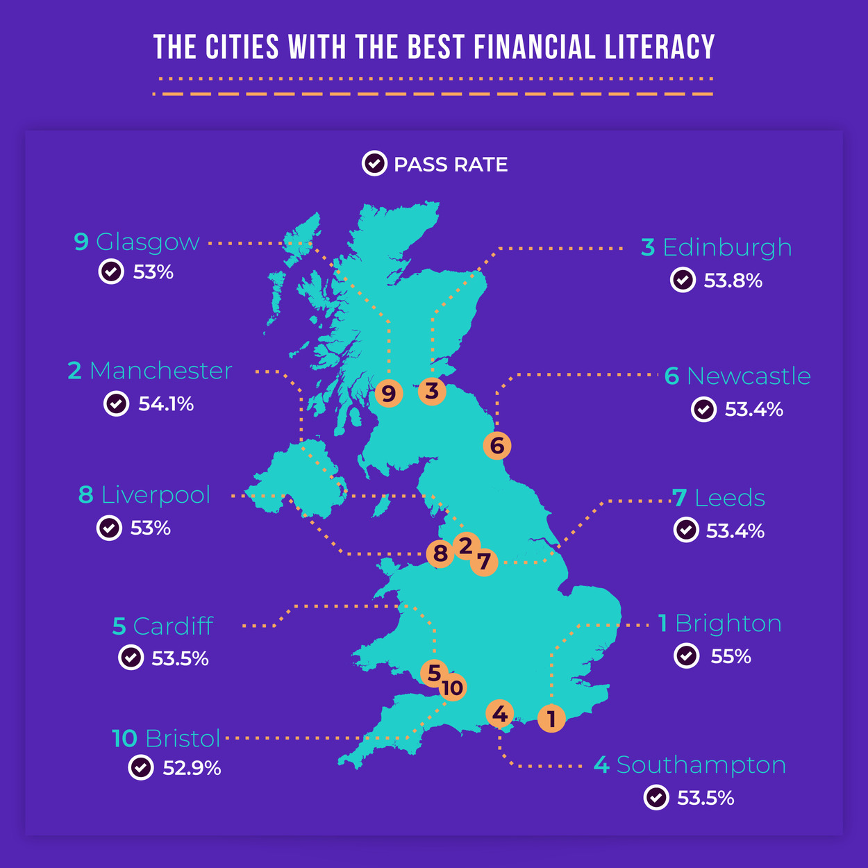 Respondents from Brighton had the highest financial literacy in Freetrade’s study with a 55% pass rate overall, followed by Manchester and Edinburgh at 54%. Belfast in Northern Ireland scored the lowest with 51%.
